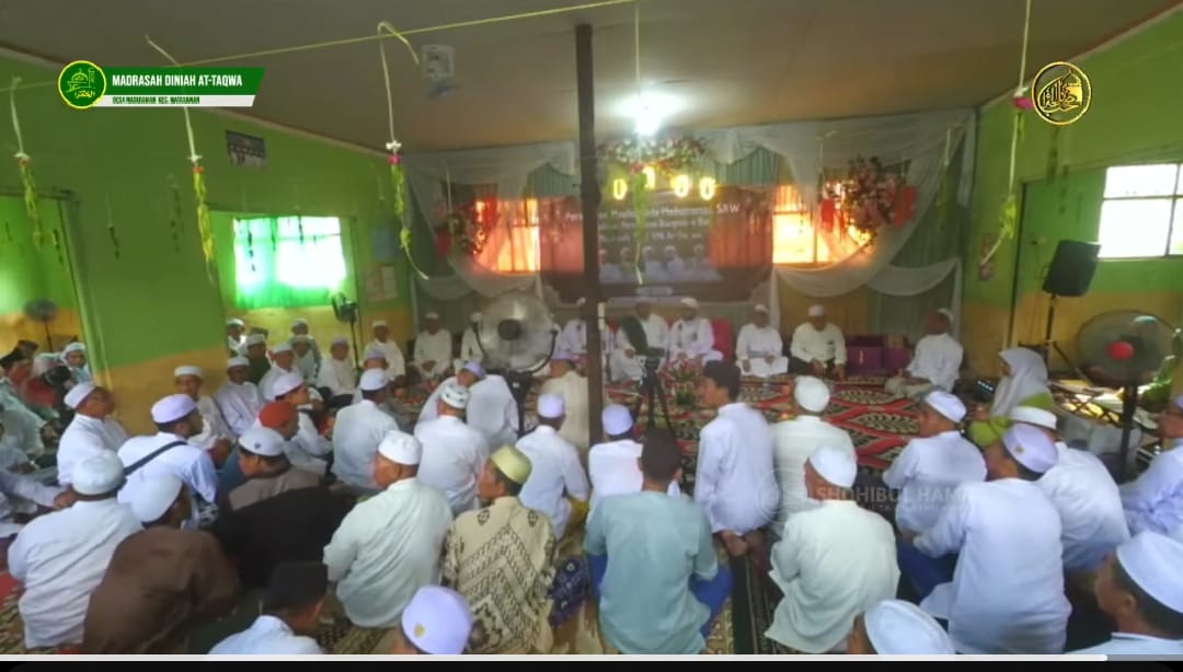 Peringatan Maulid Nabi Muhammad SAW di Madrasah At-Taqwa, sekaligus peresmian bangunan baru. Pada tanggal 24 September 2025 pukul 01:49:30, Madrasah At-Taqwa dipenuhi dengan nurani yang penuh cinta dan penghormatan kepada Nabi Muhammad SAW. Tujuan dari peringatan Maulid ini sangatlah mulia dan mendalam. Salah satunya adalah untuk mengenang sekaligus bersyukur atas kelahiran Nabi Muhammad SAW, utusan Allah yang menjadi rahmat bagi semesta alam. Melalui perayaan ini, kita semua diajak untuk meneladani akhlak mulia beliau, seperti kejujuran, kecerdasan, dan kasih sayang yang tanpa batas. Selain itu, peringatan ini juga bertujuan untuk memperkuat iman dan keislaman umat. Dengan merenungkan kehidupan dan ajaran Nabi, diharapkan umat Islam dapat memperkuat keyakinan dan semangat dalam menjalani kehidupan mereka sehari-hari. Tidak hanya itu, peringatan Maulid juga menjadi momentum penting untuk mempererat persaudaraan sesama Muslim melalui ukhuwah islamiyah. Kehadiran dalam acara ini tidak hanya sebagai individu, tetapi juga sebagai bagian dari satu umat yang bersatu dalam agama dan keimanan. Lebih dari sekadar perayaan, peringatan Maulid Nabi Muhammad SAW di Madrasah At-Taqwa pada tahun ini juga dimaksudkan untuk meningkatkan rasa cinta kepada Rasulullah SAW. Dengan mencintai Nabi, kita akan lebih mendekatkan diri kepada ajaran-Nya dan menjalankan sunnah-sunnah yang beliau ajarkan. Terakhir, peringatan ini juga merupakan wujud rasa syukur kepada Allah SWT atas nikmat agung berupa kehadiran Nabi Muhammad SAW di tengah-tengah umat manusia. Keberadaan Nabi sebagai penutup para rasul menjadi cahaya petunjuk bagi seluruh umat manusia. Dengan penuh kekhidmatan dan kebersamaan, peringatan Maulid Nabi Muhammad SAW di Madrasah At-Taqwa telah menjadi salah satu tonggak keimanan dan kecintaan umat Islam. Semoga setiap tahunnya, kita dapat terus merayakan momentum berharga ini dengan penuh keikhlasan dan ketulusan hati.